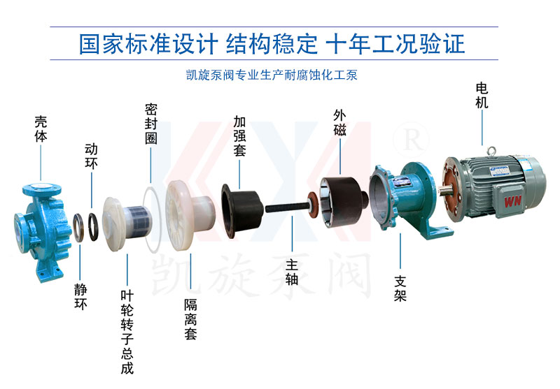 IMC型甲苯泵,過流部件使用氟塑料及合金復合材料制造,是應用磁力學原理,利用內外永磁體傳動,實現扭矩無接觸傳遞,當電動機帶動外轉子總成旋轉時,通過磁場的作用磁力線穿過隔離套帶動內轉子總成和葉輪同步旋轉,外轉子旋轉時隔離套靜止,隔離套將介質完全密封,從而達到無泄漏輸送介質的目的。解決了機械傳動泵的軸封跑、冒、滴現象。非常適合輸送任意濃度的酸、堿、有機溶劑、易燃易爆和貴重液體等。